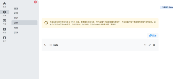 步骤 #03 这时候你已经成功添加了一个区块,但这个区块里还没有内容,点击代码编辑按钮弹出编辑面板